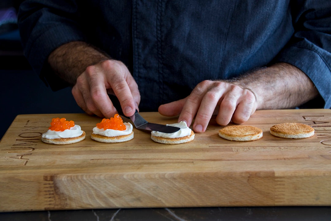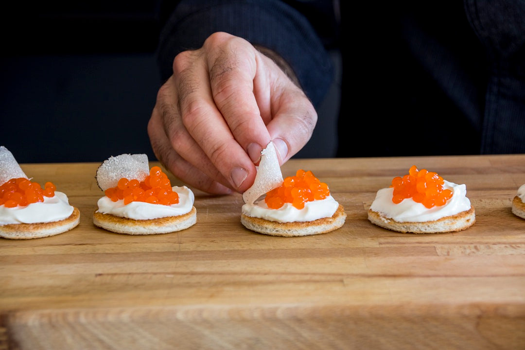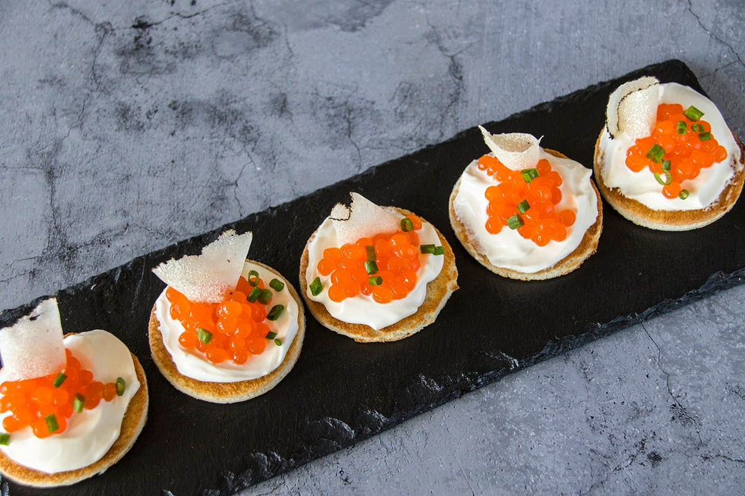 Un amuse-bouche raffiné et élégant, qui marie à la perfection la douceur acidulée de la crème fraîche, la salinité délicate des œufs de saumon et l’arôme intense de la truffe d’été Laumont finement tranchée. Parfait pour sublimer un apéritif de fête.