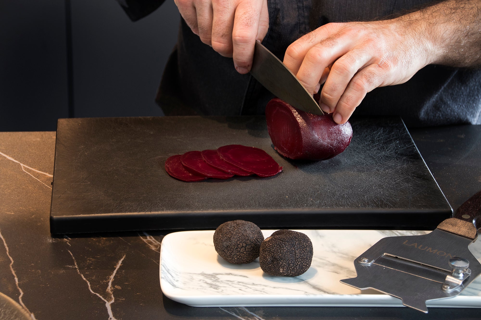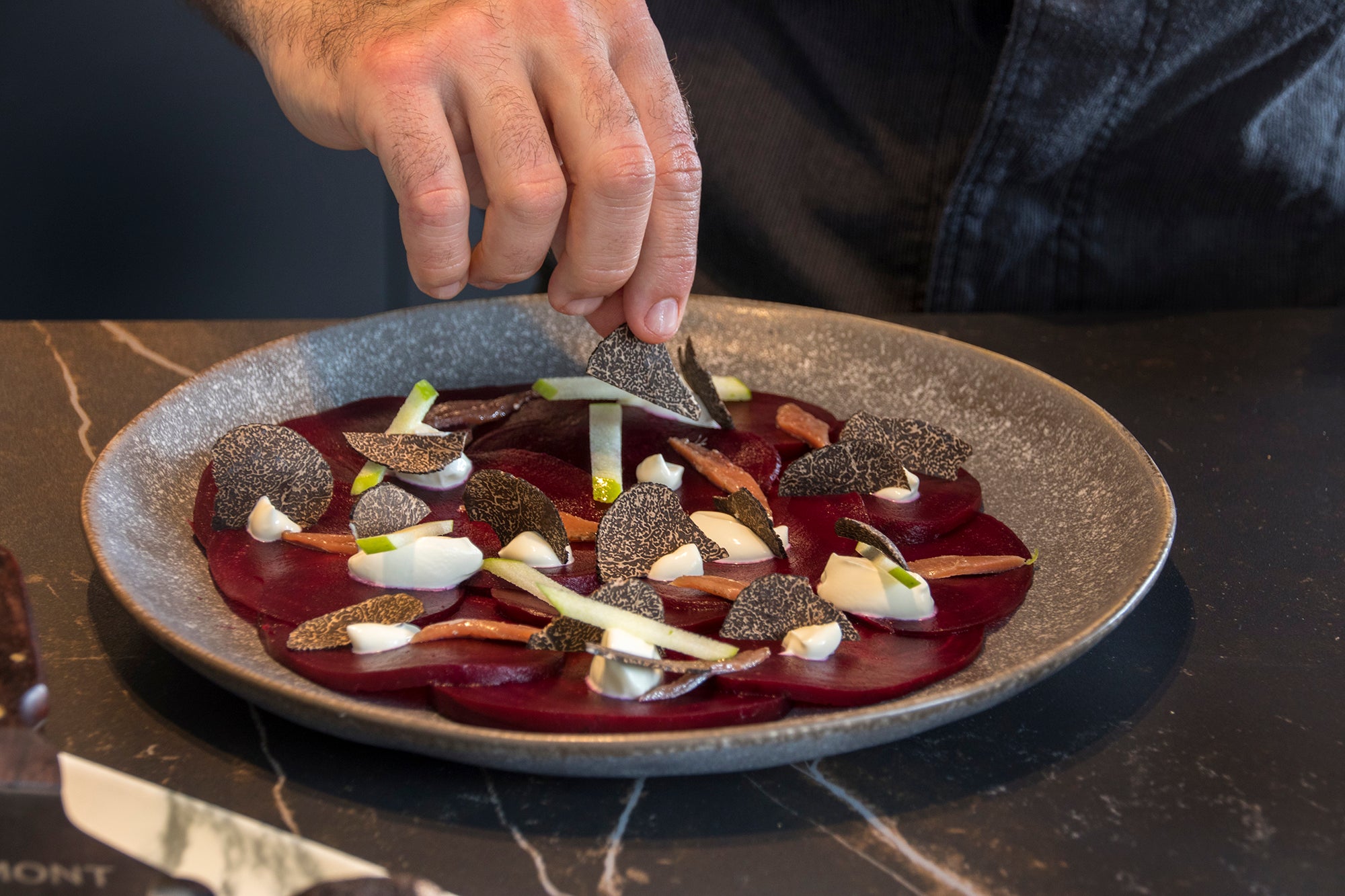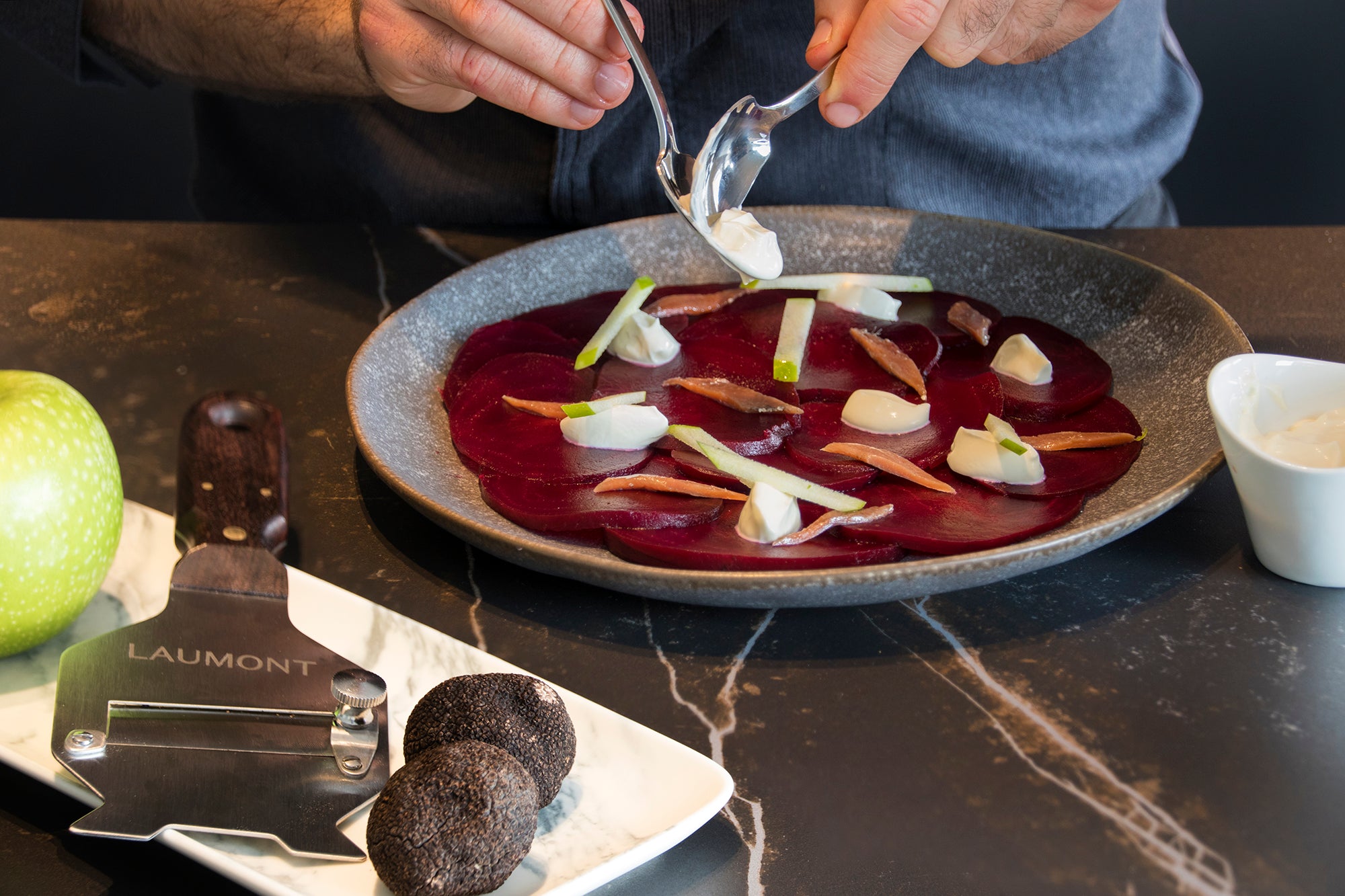 Une entrée fraîche et élégante où la douceur terreuse de la betterave rencontre la richesse de la crème fraîche, le croquant fruité de la pomme, l’umami de l’anchois et le parfum noble de la truffe noire de Laumont. Une recette sans cuisson, équilibrée et pleine de raffinement.