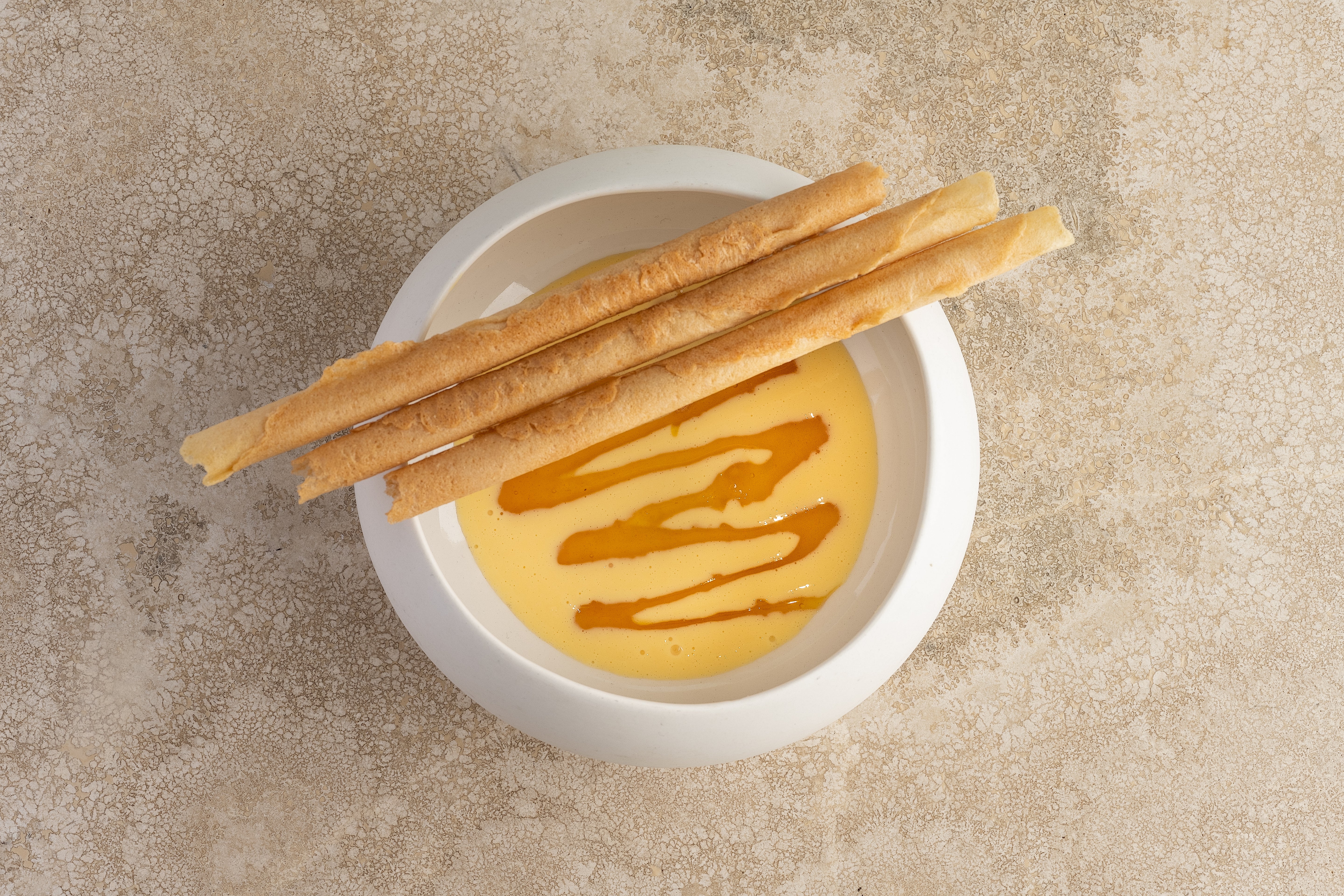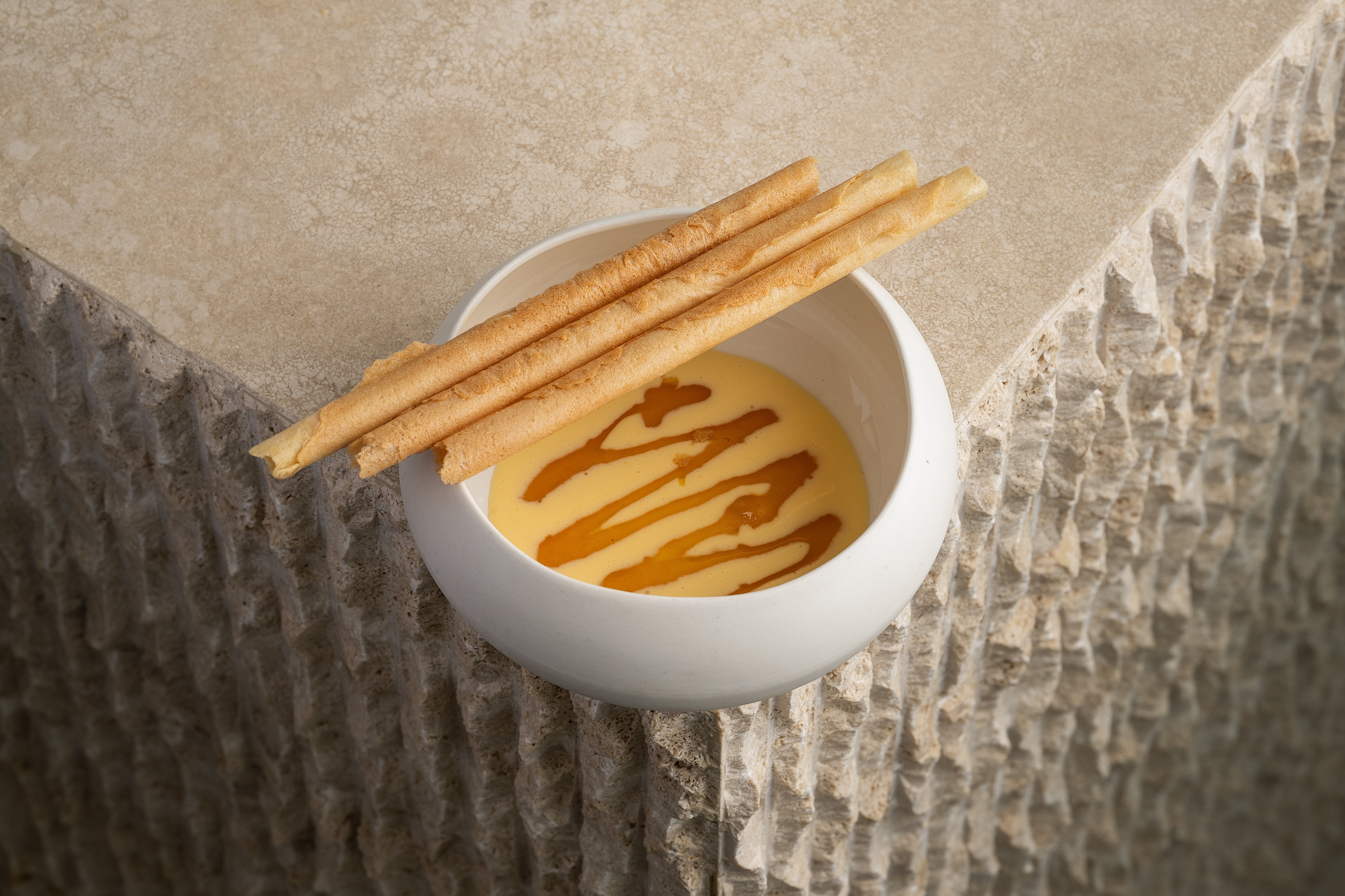 Une délicieuse association de textures et saveurs où la fraîcheur acidulée de la crème au citron rencontre la douceur fruitée de la gelée d’orange, servies avec de légères neules croquantes. Un dessert élégant parfait pour clôturer un repas avec finesse.