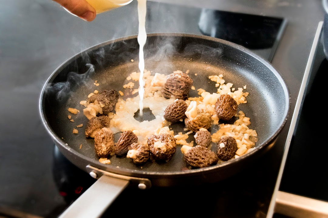 Ingrédients pour le oeuf d’oie sur le plat aux morilles, aux artichauts et au jambon de canard