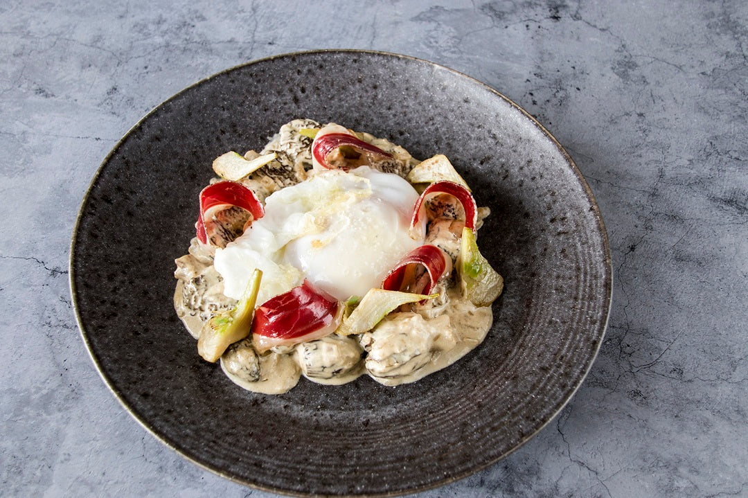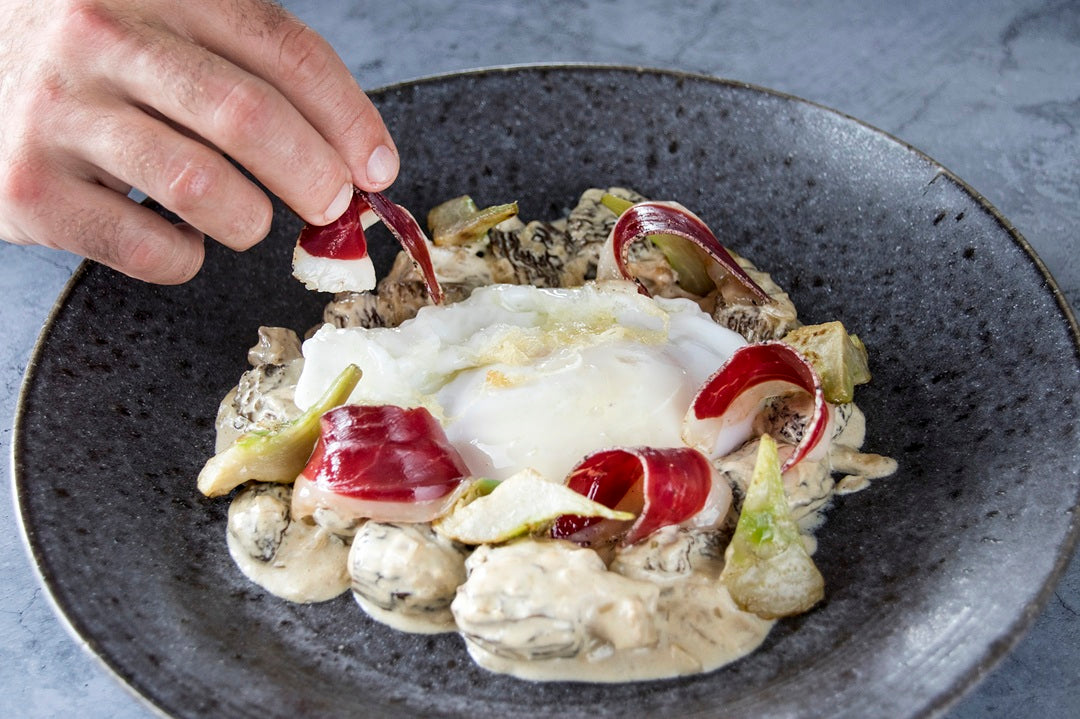 Une recette de caractère où l’œuf d’oie se pare de nobles saveurs : les morilles Laumont à la crème, des artichauts fondants et du jambon de canard affiné. Une création équilibrée, gourmande et idéale pour une occasion spéciale.