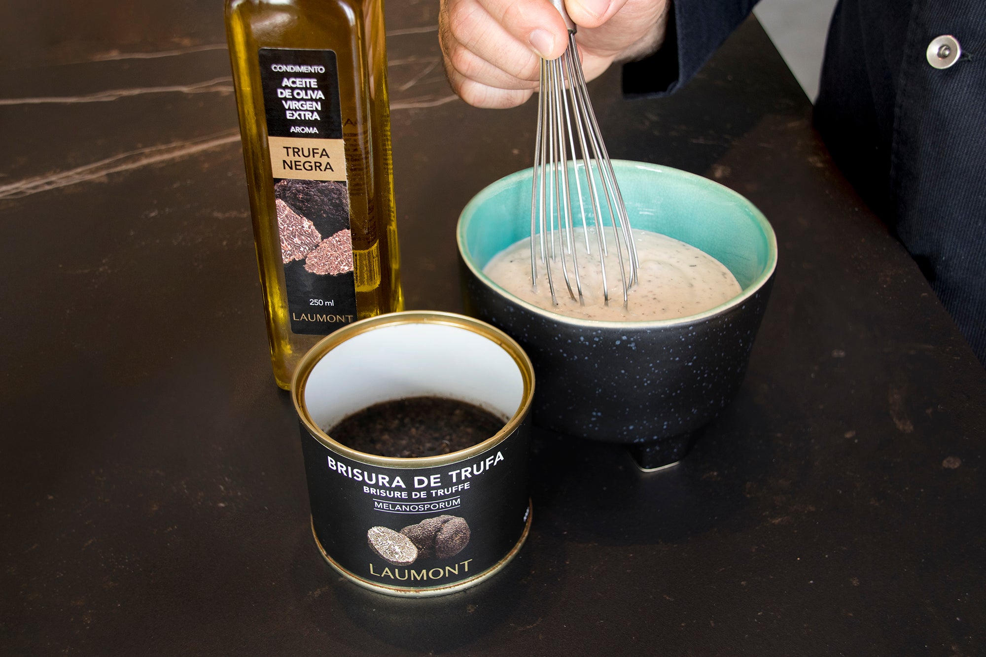 Un classique revisité avec élégance : ces bouchées croustillantes à l’extérieur et fondantes à l’intérieur sont sublimées par une mayonnaise maison enrichie d’huile de truffe et de brisure de truffe noire Laumont. Une entrée raffinée à servir chaude et à savourer sans modération.