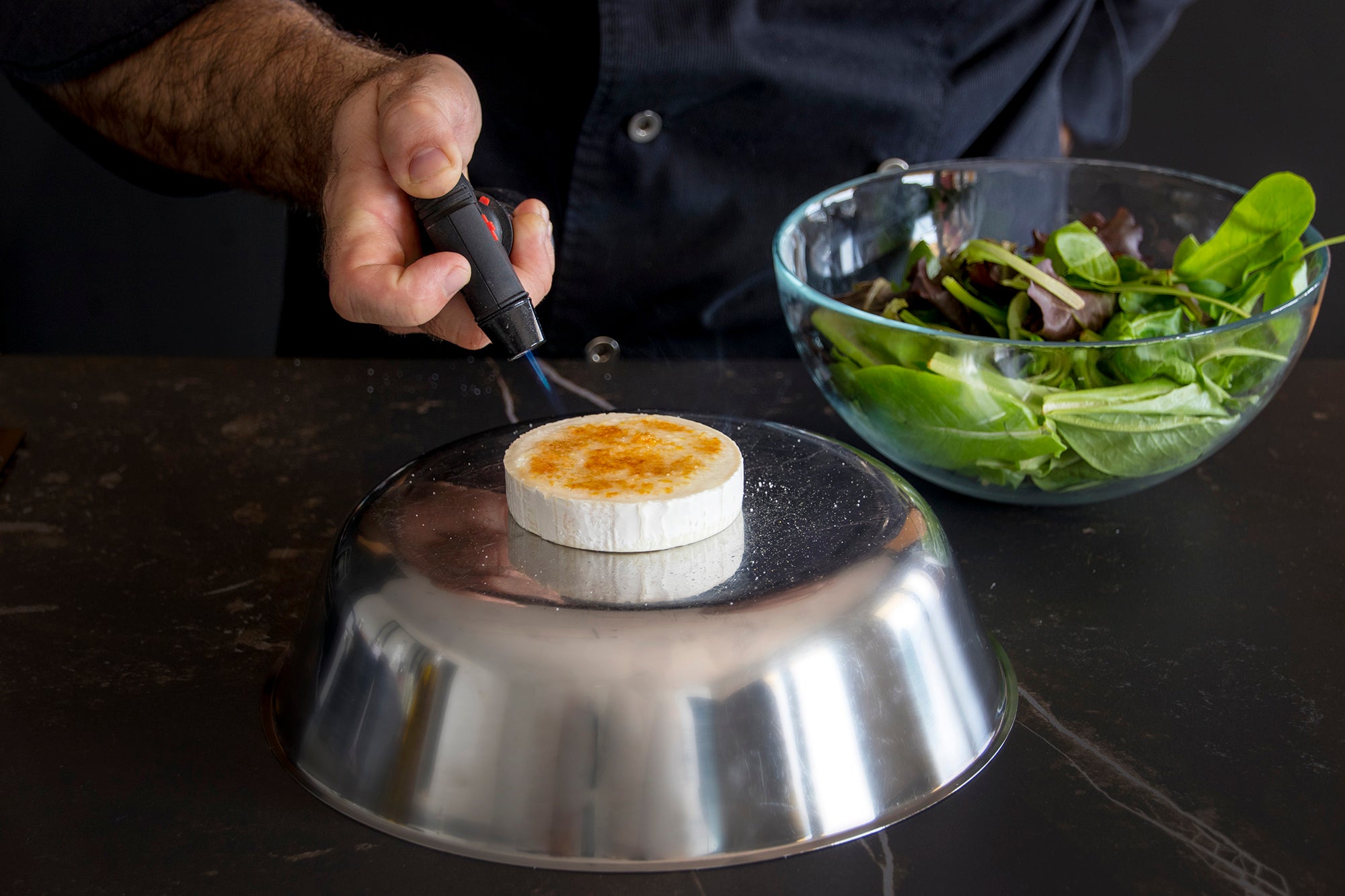 Une salade tiède et raffinée où le fondant du fromage de chèvre doré au chalumeau rencontre le parfum des bolets confits à l’huile d’olive et au vinaigre de truffe blanche Laumont. Les figues et artichauts ajoutent une touche sucrée et végétale à cette entrée pleine d’élégance.